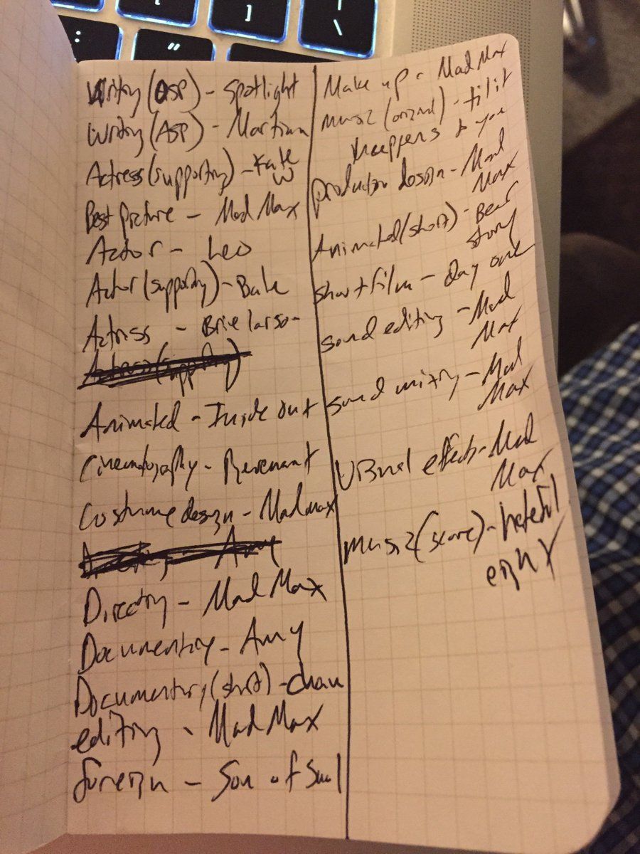 Probably hard to read but I wrote out my predictions #oscars2016 #OscarPredictions