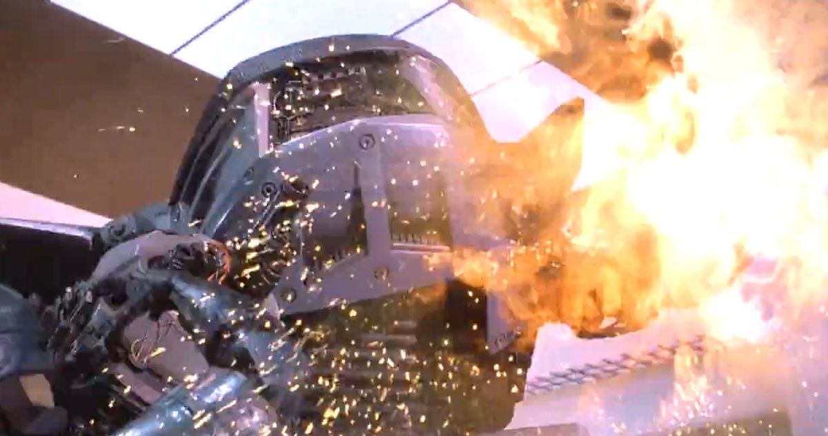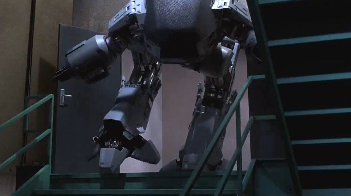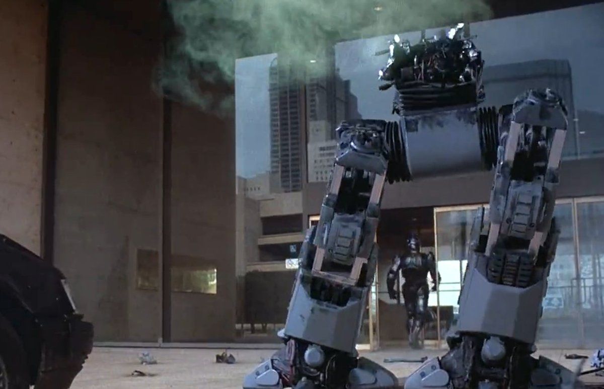 RoboCop makes the first super scary killer robot shoot itself in the arm and then it falls down the stairs because its feet are too big. The second one RoboCop just shoots once and it explodes and it's legs just walk around for a while. Maybe these are all the same robot?