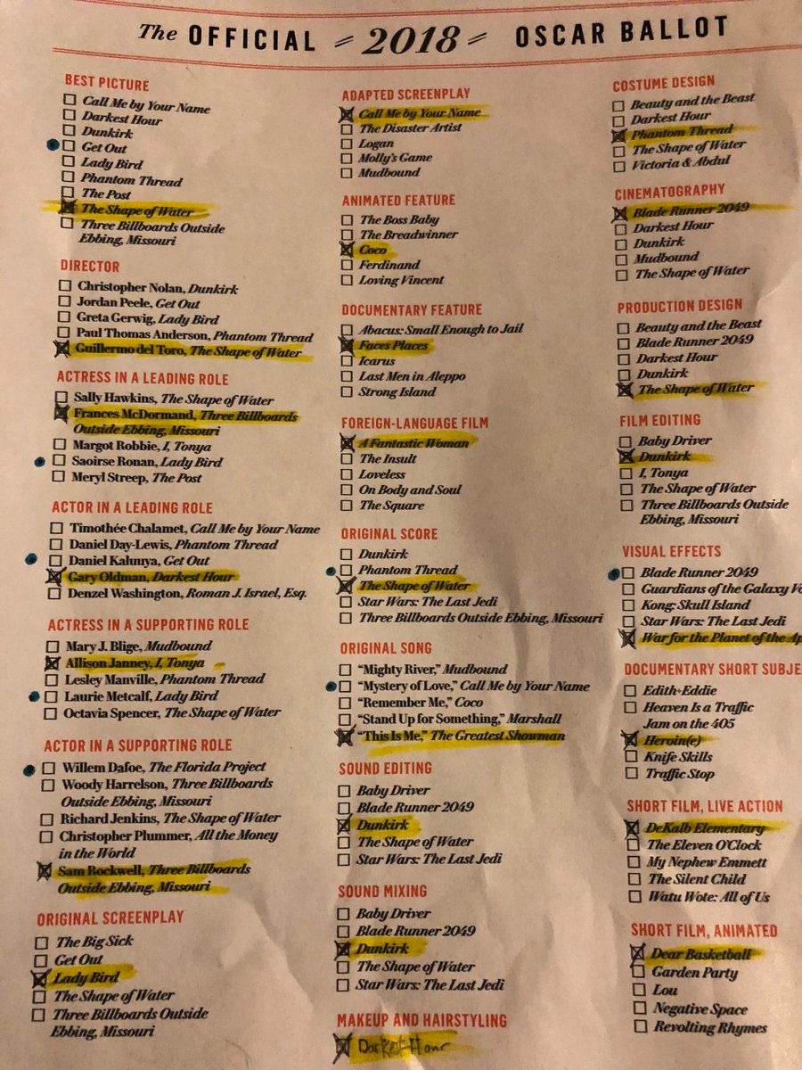 Here’s my picks for tonight. Highlight mean I think it’ll win, blue dots are my preference if I have one that’s different than my pick. #Oscar2018 #Oscars
